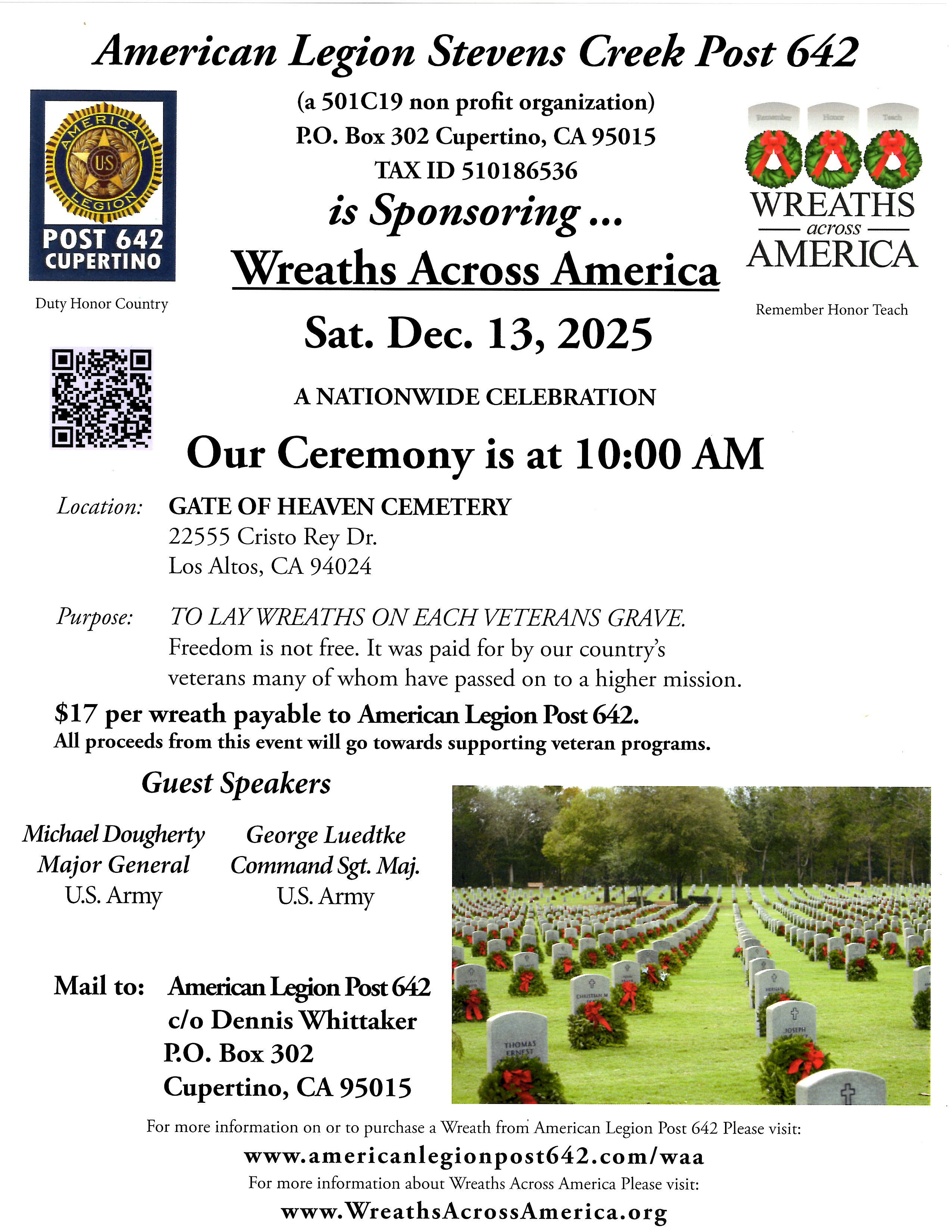 Post 642 continues to rely on the participation of the various Scout and Girl Scout Troops from Cupertino, San Jose and Sunnyvale who play a key role in the preparation of the sites, such as placing American Flags, setting up wreath easels and placing the wreaths on the easels and markers the day of the ceremony. These scouts along with their parents continue to volunteer and help us with this ceremony and with other activities in our community through the year. We are proud of their volunteer work for the WAA ceremony and other activities as they continue to find a way to serve their community!